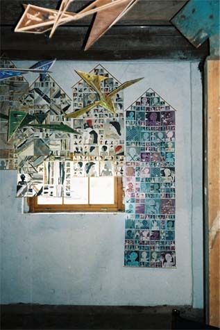 Zweigeteilte Menschen, Häuser mit farbigen Gesichtern, bunte Vögel, eine in Papierstreifen eingewickelte