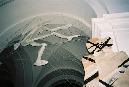 Figur aus durchscheinendem Vließ scheint sie gleichfalls durch Bänder und Fäden einzubinden und
