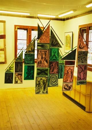 Installation aus farbigen Kartonflächen mit Linolschnitten beidseitig bedruckt und montiert. |