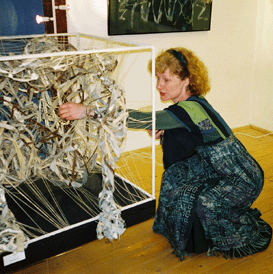 Zu sehen sind etwa 40 textile Collagen, Drucke, Objekte und Bilder, in denen Gemütszustände,