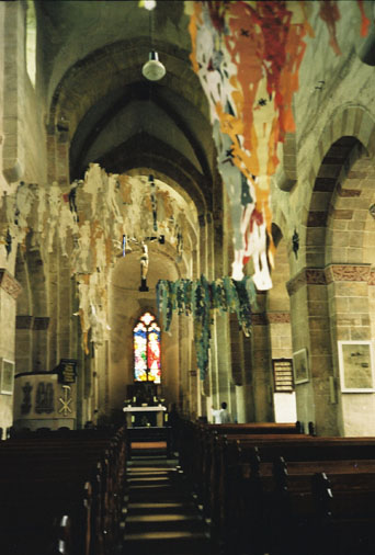 Motiven bedruckten Papierflächen hat H.H.Henze die Seitengänge geschmückt...Jahrhunderte alte steinerne Säulen, Bögen, Gänge